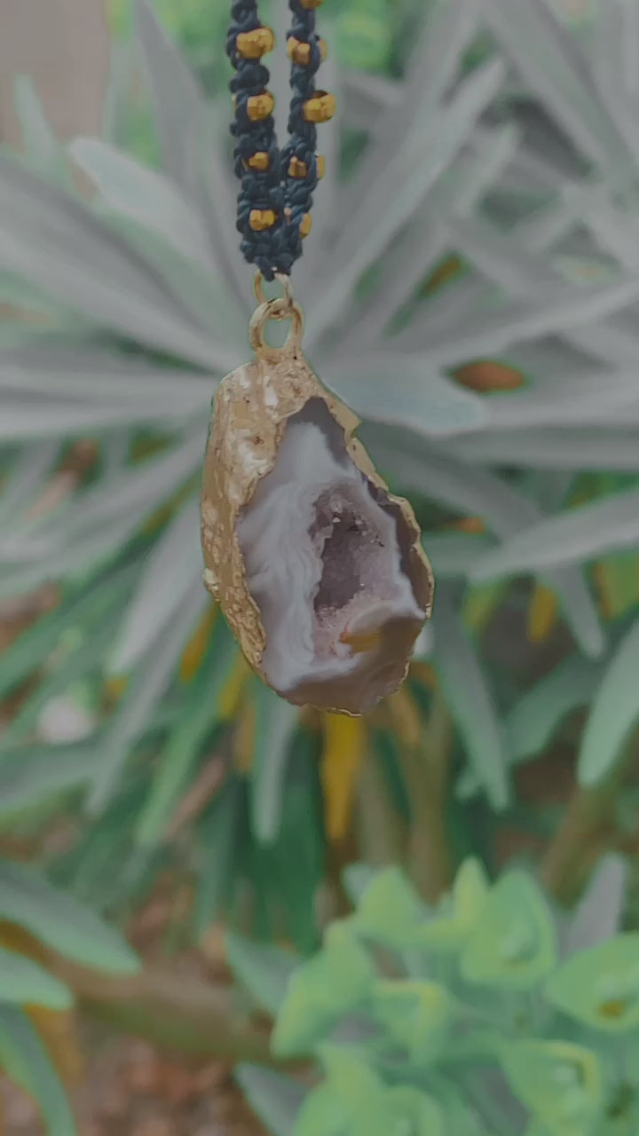This captivating handwoven macrame necklace features a gold electroplated Druzy Agate pendant. Designed with meticulous craftsmanship, the mysteriously stunning Enchanted Necklace ends in an adjustable woven clasp for a perfect fit. Available in elegant navy and classic black, it’s the ideal accessory to add a touch of mystique and sophistication to any outfit.